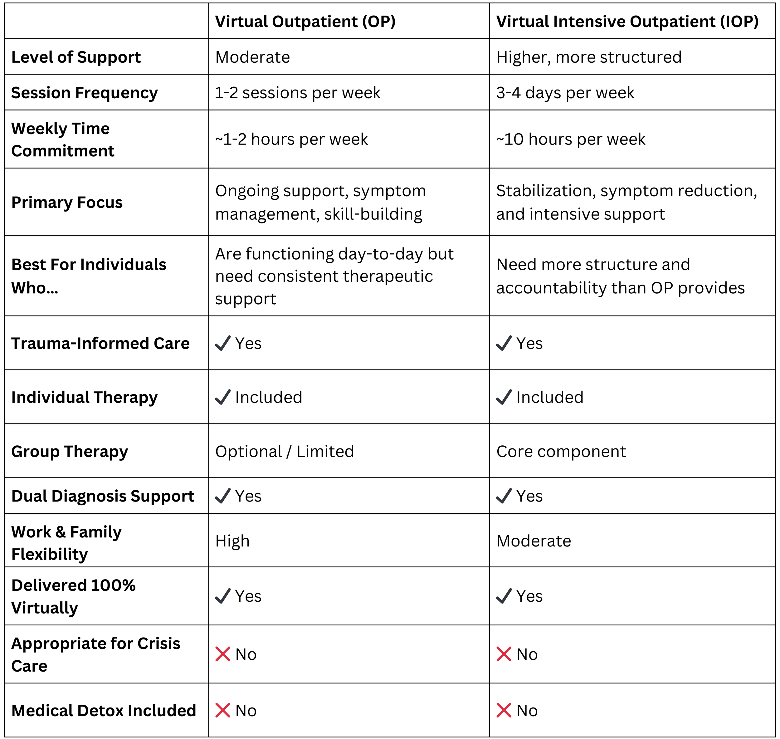 Our Virtual OP and Virtual IOP programs are not designed for crisis or inpatient care and are not appropriate for individuals requiring: